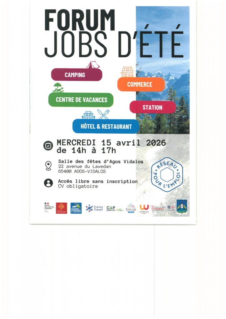 Viens nous rencontrer au forum "Jobs d'été" le mercredi 15 avril à Agos-Vidalos (avant Argelès-Gazost) avec un CV ! et trouves un job pour l'été ! A très vite !!